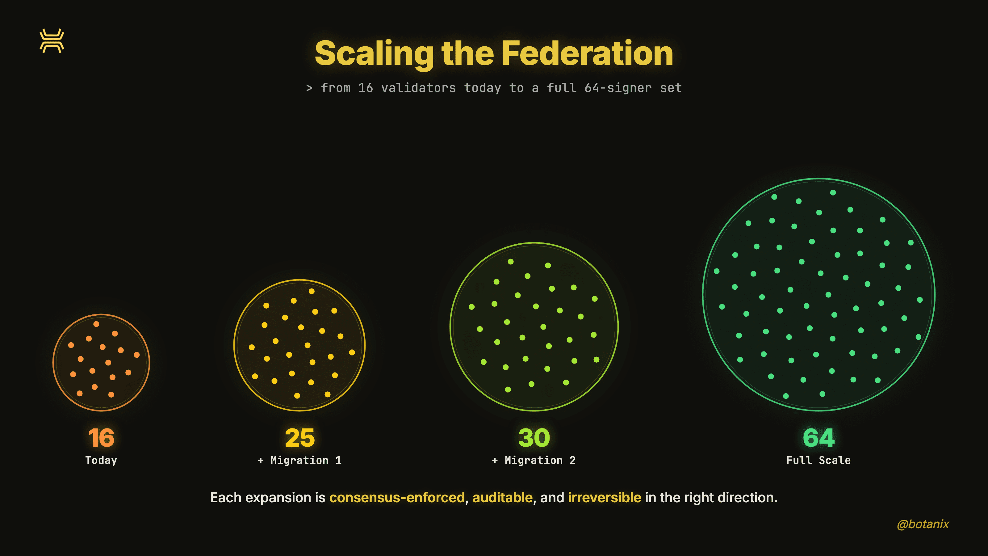 16 → 25 → 30 → 64 signers through successive DynaFed migrations. Each expansion follows the same consensus-enforced process covered in Part 4 - DKG, on-chain attestation, hard fork activation, dual-peg grace period, final sweep.