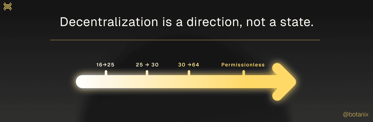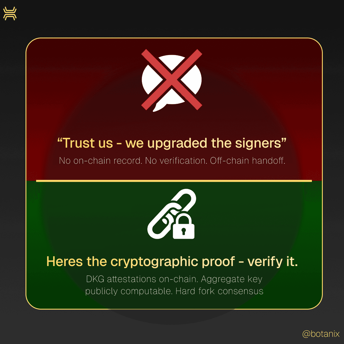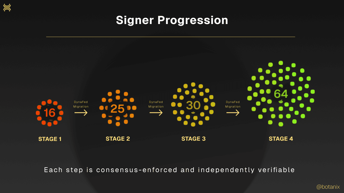 Botanix can use this process to grow the federation from 16 signers to 25, then to 30, then to 64 with each expansion a concrete, auditable step toward broader trust distribution.
